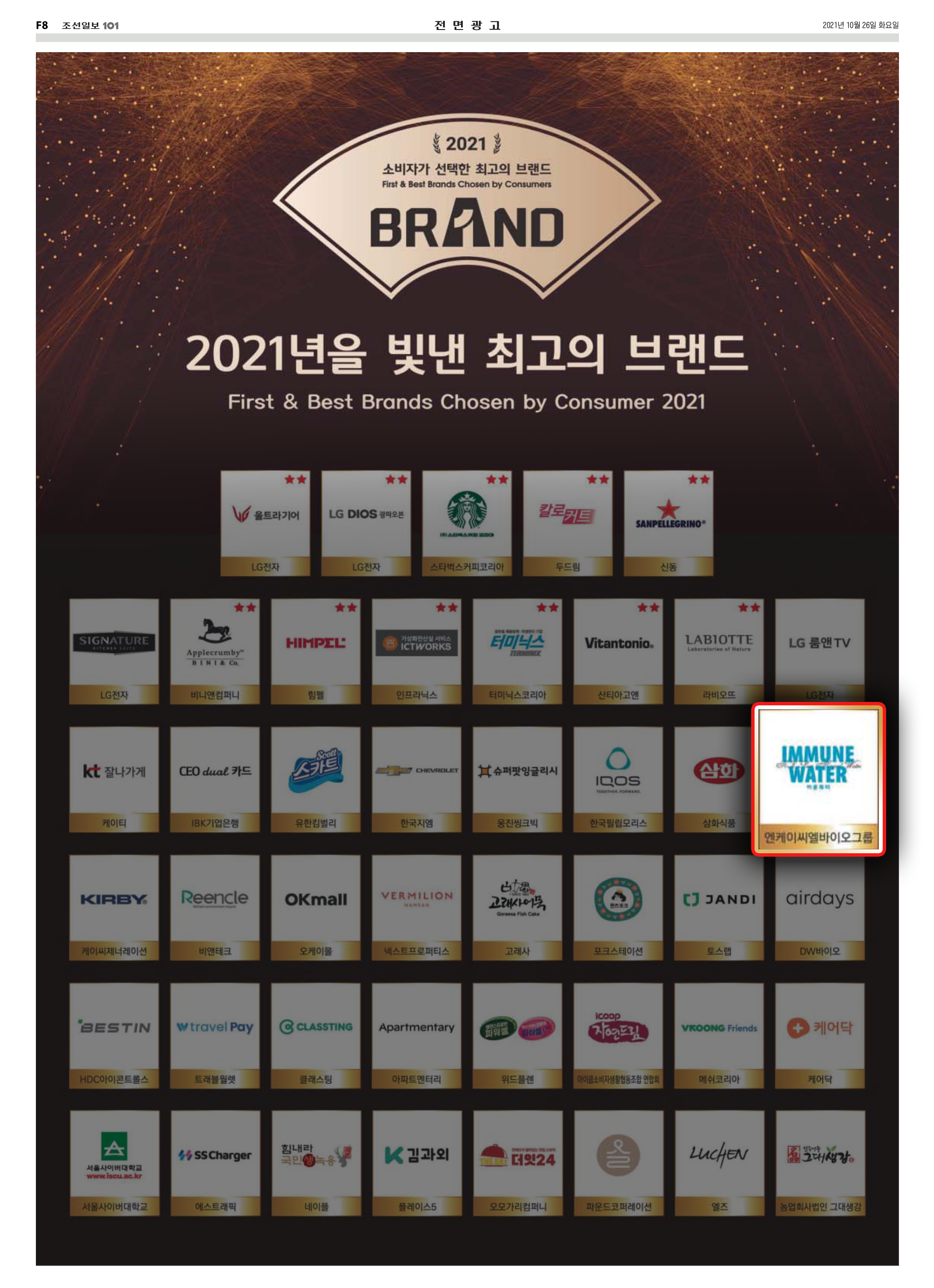 ㈜엔케이씨엘바이오그룹(이하 ‘NKCL바이오그룹’)의 해양심층수 ‘NK 이뮨워터’가 조선일보에서 주관한 ‘소비자가 선택한 ‘2021 최고의 브랜드’에 선정되었다. NKCL바이오그룹은 LG디오스, 스타벅스, 쉐보레, 에어데이즈, 산펠레그리노 등과 함께 수상의 영예를 얻었다. "NKCL바이오그룹의 해양심층수 ‘NK이뮨워터’는...