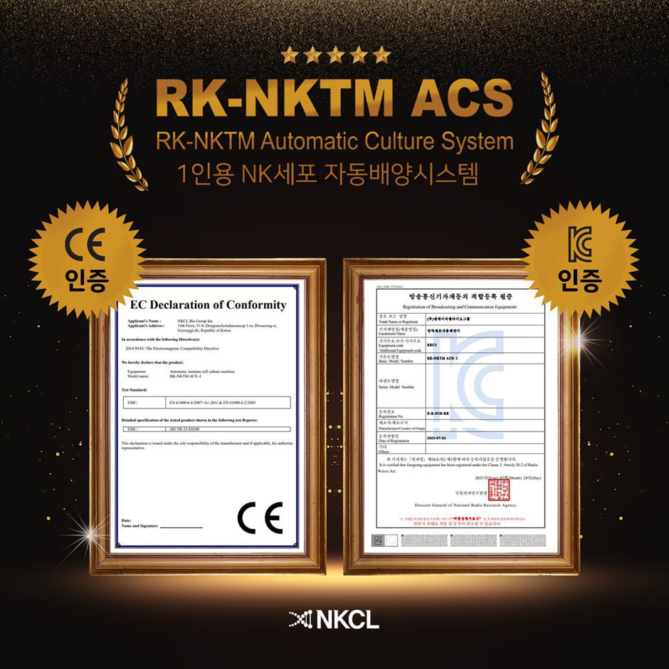 NKCL Bio Group announced on the 31st that it has obtained both CE certification and KC certification on the 27th for ‘RK-NKTM ACS (hereinafter referred to as ACS-I)’, an automatic single-person NK cell cultivator released this year. CE certification is an integrated standard certification mark mean...