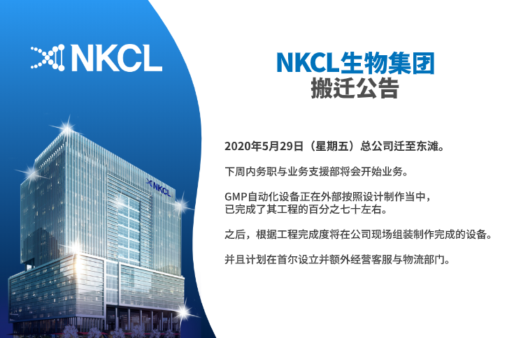 5月9日 总公司3D效果图 由于受到新冠肺炎疫情的影响,在许多工程与设备材料上供应不畅,导致工程进展缓慢,但“NK细胞GMP自动化培养系统”还是如期顺利的进行着。 将位于东滩尖端知识产业区内的(株)NKCL生物集团自动化培养系统不仅进行NK细胞的研究与开发、培养,还设计成为一站式系统同时起到进行相关的业务处理以及物流中心...