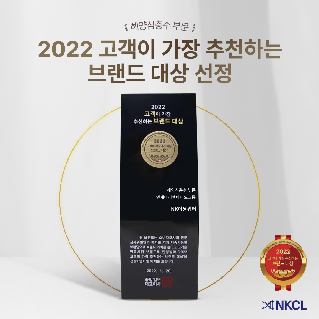 (株)NKCL生物集团的NK Immune Water,20日在中央日报和经济学人(The Economist)主办、赞助的“2022顾客最推荐的品牌大奖”中,在海洋深层水领域获得了大奖。“顾客最推荐的品牌大奖”通过对品牌质量和消费者满意度认识调查和专家审查,推选得到认证、具有可靠性和专业性的品牌,为消费者提出明智的消费活动指标而努力。 NK I...