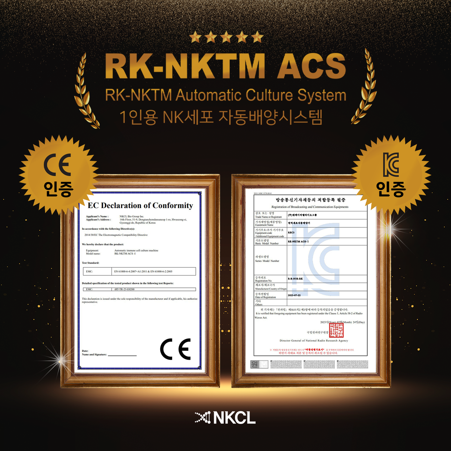 NKCL바이오그룹은 올해 출시된 1인용 NK세포 자동 배양기 ‘RK-NKTM ACS(이하 ACS-I)’에 대해 지난 27일 CE인증과 KC인증을 모두 획득했다고 31일 밝혔다. CE인증이란 안전, 건강, 환경 및 소비자보호와 관련해 유럽연합(EU)의 요구사항을 모두 만족한다는 의미의 통합규격인증마크이며, KC인증은 대한민국의 지식경제부, 노...